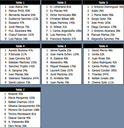 | Jugador | Fichas | Progreso |