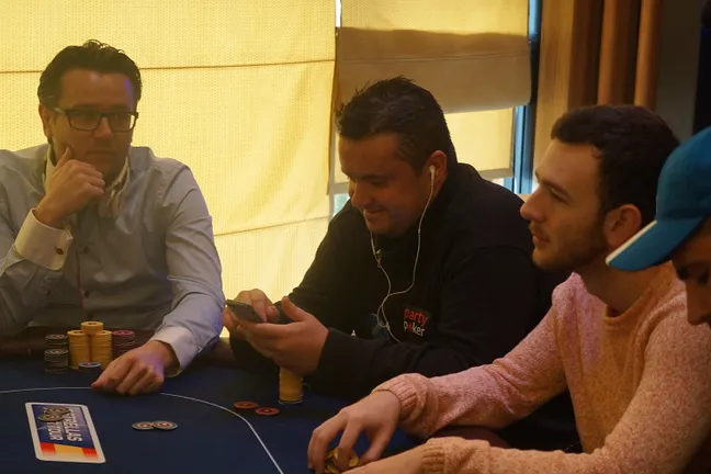 Llegamos a una mesa con un flop de y el jugador alemán Traut Heinz apuesta 7.800 contra Vitaliy Shepitko y este paga para ver el del turn. 'Boomer' apuesta otras 7.900 fichas y Shepitko se levanta con un check-raise hasta las 20.400 fichas, a lo que el jugador germano responde con un all in inmediato. Vitaliy Shepitko foldea tras pensarlo por un rato con , dobles parejas.